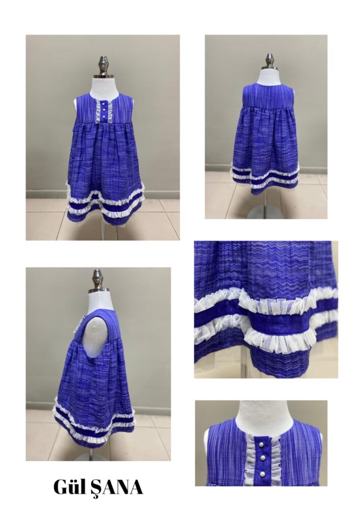 Bu modelim 9-10 yaş kız çocuk elbisesi olarak tasarlanmıştır. Model Analizi şu şekildedir:Önden patlı ve üç düğmeli,robalı,büzgülü eteklidir.